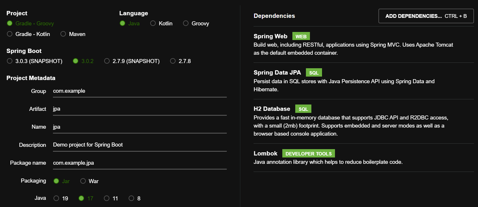 위 사이트에서 다음과 같이 dependencies를 추가해준다.