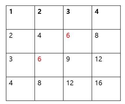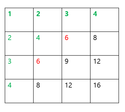 그런데 문제의 조건을 잘 보면 행과 열의 인덱스만 알고 있어도 해당 값을 구할 수 있다.