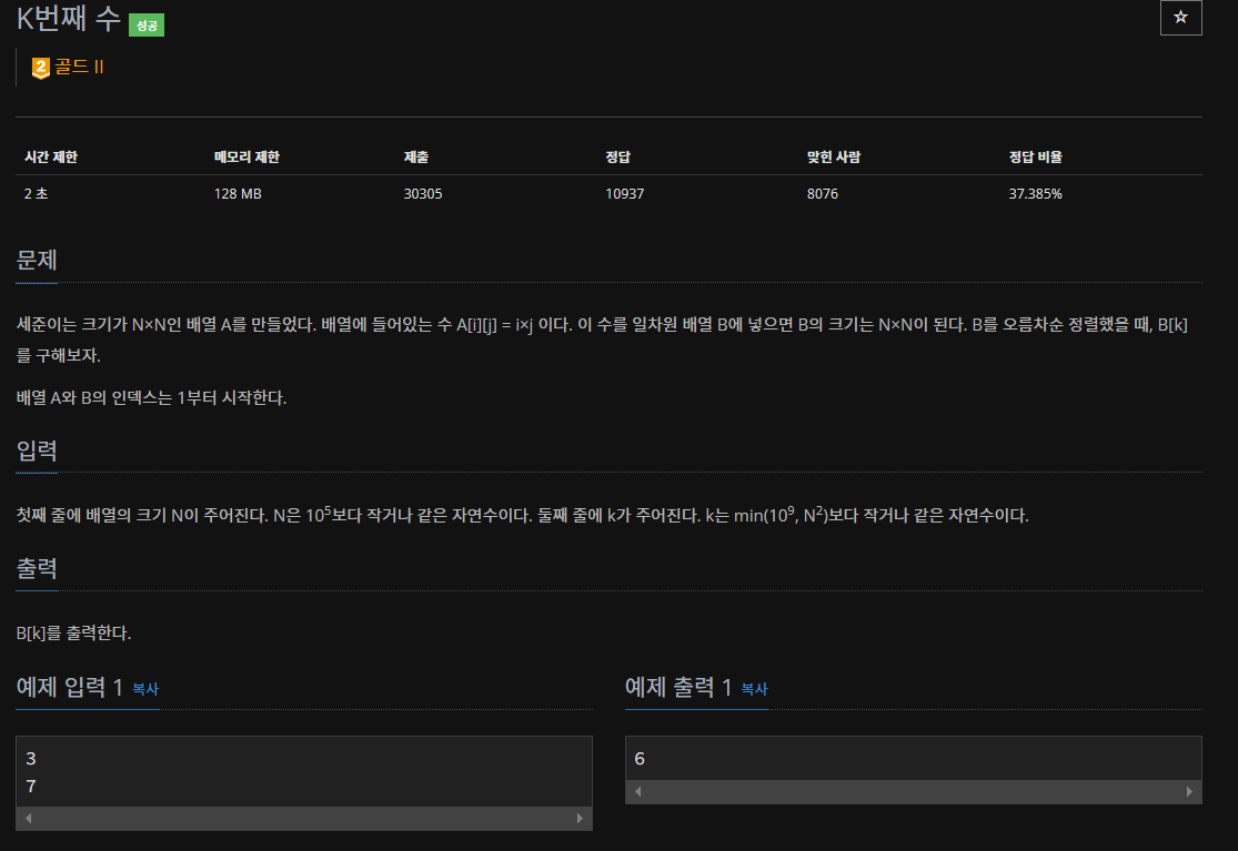 세준이는 크기가 N×N인 배열 A를 만들었다. 배열에 들어있는 수 A[i][j] = i×j 이다. 이 수를 일차원 배열 B에 넣으면 B의 크기는 N×N이 된다. B를 오름차순 정렬했을 때, B[k]를 구해보자. 배열 A와 B