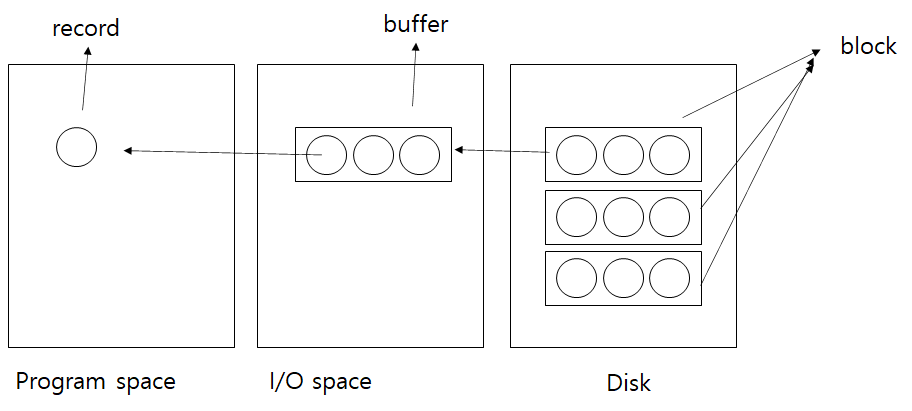 디스크 속의 블록을 읽거나 쓰는 과정은 먼저 디스크에서 I/O space의 버퍼로 블록을 가져온다.