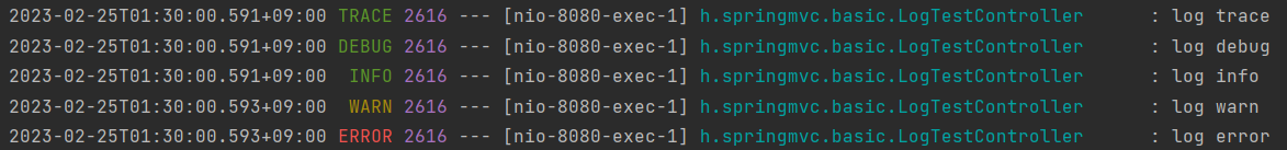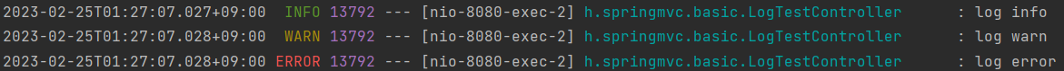 2023-02-25T01:16:17.619+09:00 INFO 18124 --- [nio-8080-exec-2] h.springmvc.basic.LogTestController : hello world