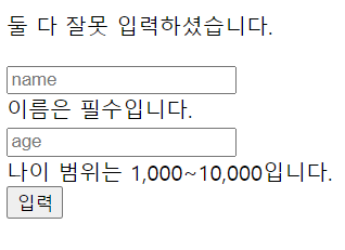 - 이름과 나이는 각각 반드시 입력해야하고 입력하지 않았다면 필드 오류 메시지를 input 태그 아래에 출력한다.