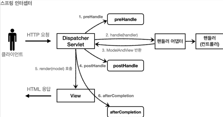 필터의 경우 요청이 들어왔을 때 doFilter 메소드 하나로 처리를 했는데 인터셉터는 위와 같이 컨트롤러 호출 전, 후, 뷰 렌더링 이후에 대한 로직을 각각 작성할 수 있는 장점이 있다.