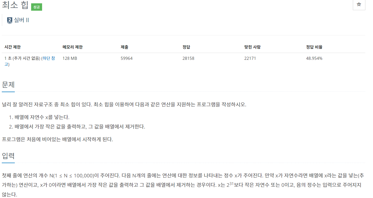 우선순위 큐의 삽입, 삭제 시간 복잡도는 O(log N)이다.