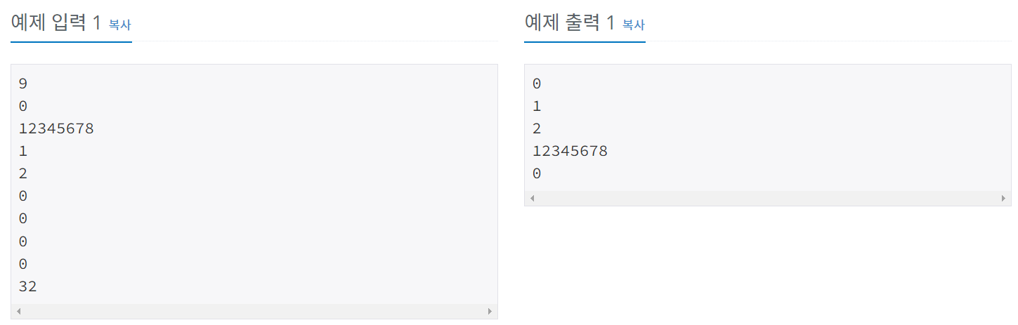 첫째 줄에 연산의 개수 N(1 ≤ N ≤ 100,000)이 주어진다. 다음 N개의 줄에는 연산에 대한 정보를 나타내는 정수 x가 주어진다. 만약 x가 자연수라면 배열에 x라는 값을 넣는(추가하는) 연산이고, x가 0