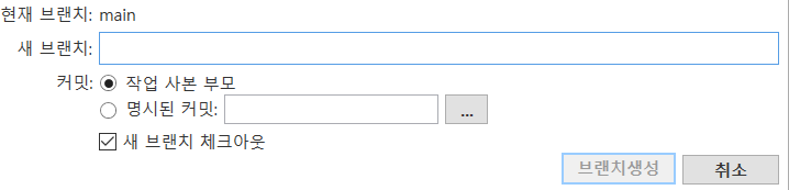 참고로 두 브랜치 모두 main 브랜치에서 생성해야 하므로 브랜치를 생성하는 위치가 main 브랜치인 것을 반드시 확인한다.