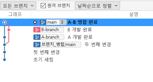 병합에 성공했다 A-branch와 B-branch가 합쳐지고 다시 main 브랜치만 남은 모습을 확인할 수 있다.
