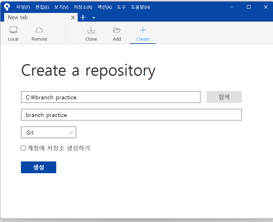 소스트리의 create를 눌러서 위에서 만든 폴더를 검색하 로컬 저장소를 생성한다.