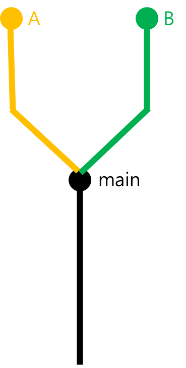이 상황에서 협업을 시작할 때 A 기능을 개발하는 브랜치와 B 기능을 개발하는 브랜치로 나누는 것이다.