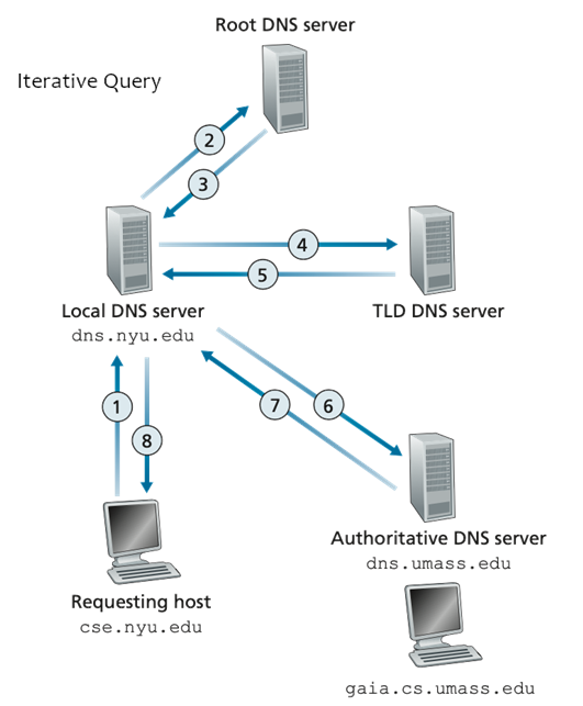 iterated query는 local DNS server가 root DNS server에게 물어보고 받은 응답을 받으면 이 응답을 가지고 TLD DNS server에게 물어보고 받은 응답을 가지고 Authoritative DNS server에게 물어보고 받은 응답을 클라이언트에게 보내준다.