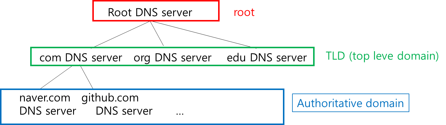 DNS는 distributed database 형태로 많은 name server들이 계층을 이루고 있다.