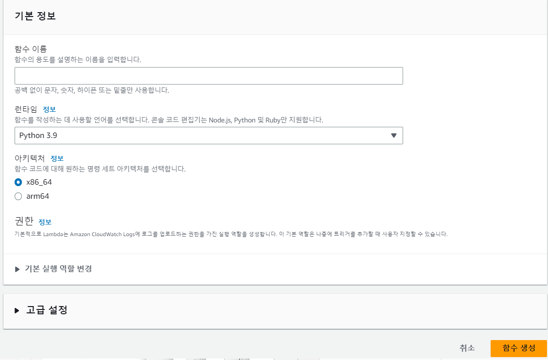 함수 이름을 정하고 런타임 언어를 설정할 수 있는데 본인에게 편한 언어를 선택하면 된다.