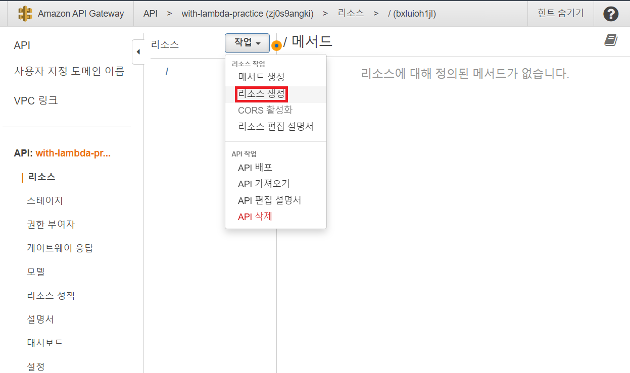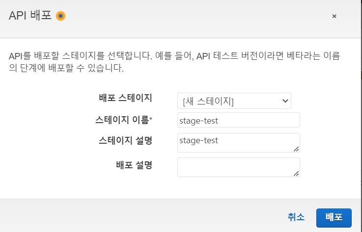 변경사항이 생겼으므로 다시 API를 배포한다. 스테이지는 이전에 사용했던 스테이지를 선택한다.