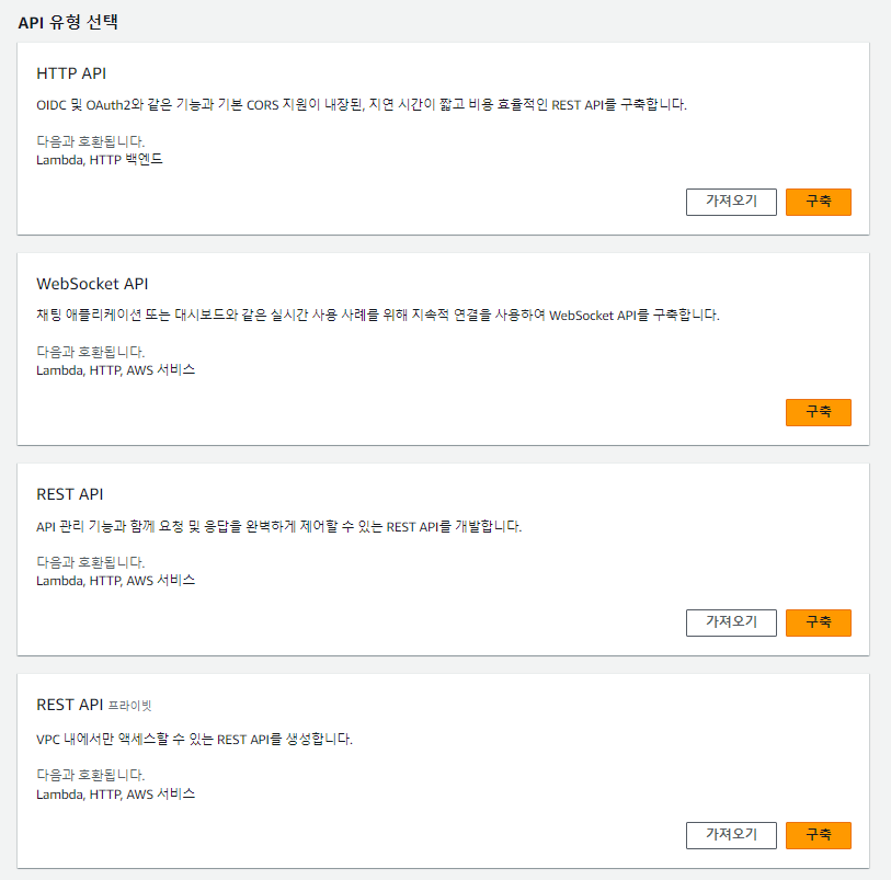 aws 관리자 계정으로 로그인해서 API gateway로 들어가면 다음과 같이 4가지 API 유형을 선택할 수 있다.