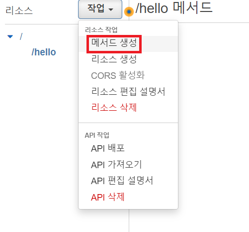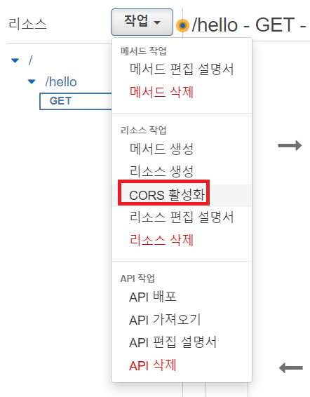 우리가 만든 API gateway 리소스에 들어가서 메소드를 선택한 후 작업 -> CORS 활성화를 눌러준다.