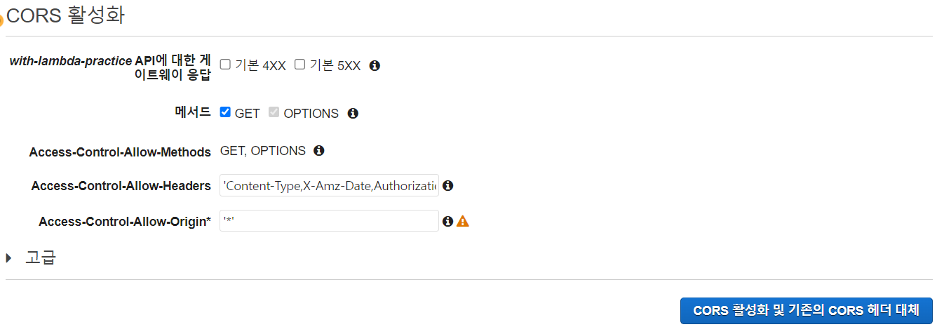 설정되어있는 값 그대로 CORS 활성화 및 기존의 CORS 헤더 대체를 눌러준다.