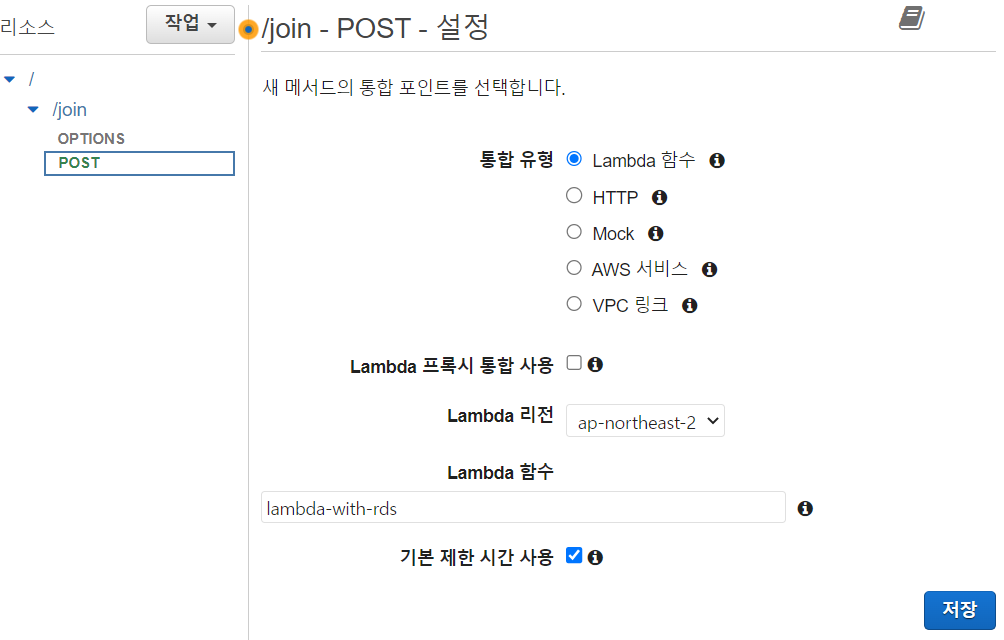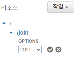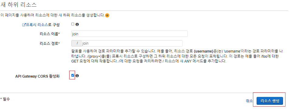 외부에서 접속할 수 있어야 하므로 CORS 활성화를 체크하고 경로를 /join으로 리소스를 생성한다.
