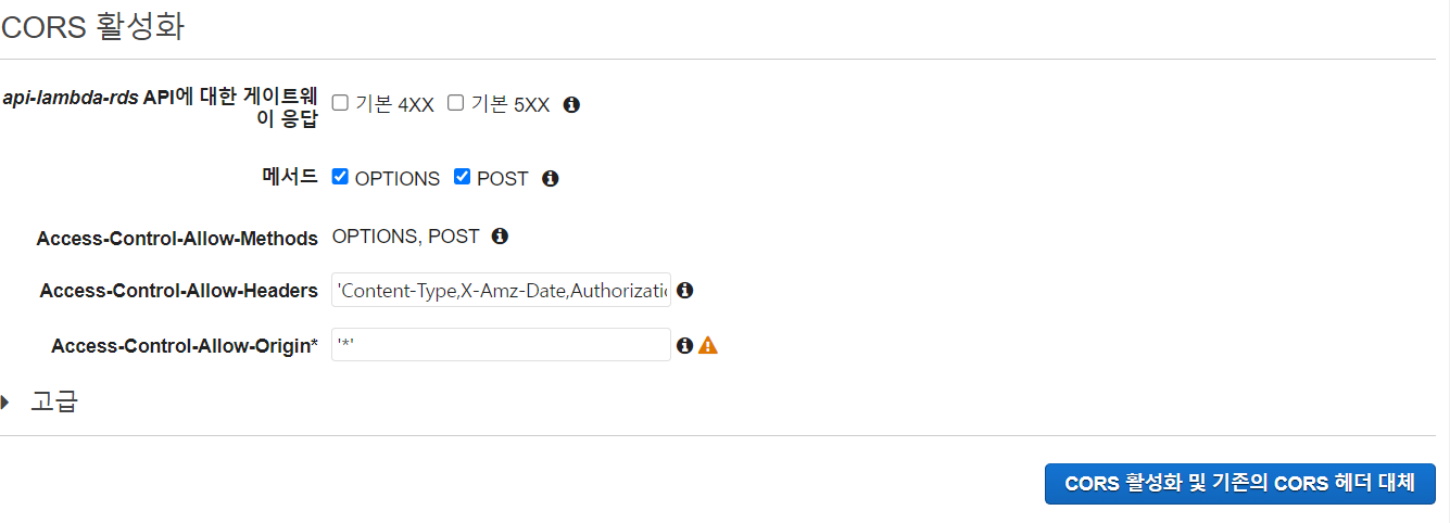 만든 POST 메소드를 선택하고 CORS 활성화를 한다.