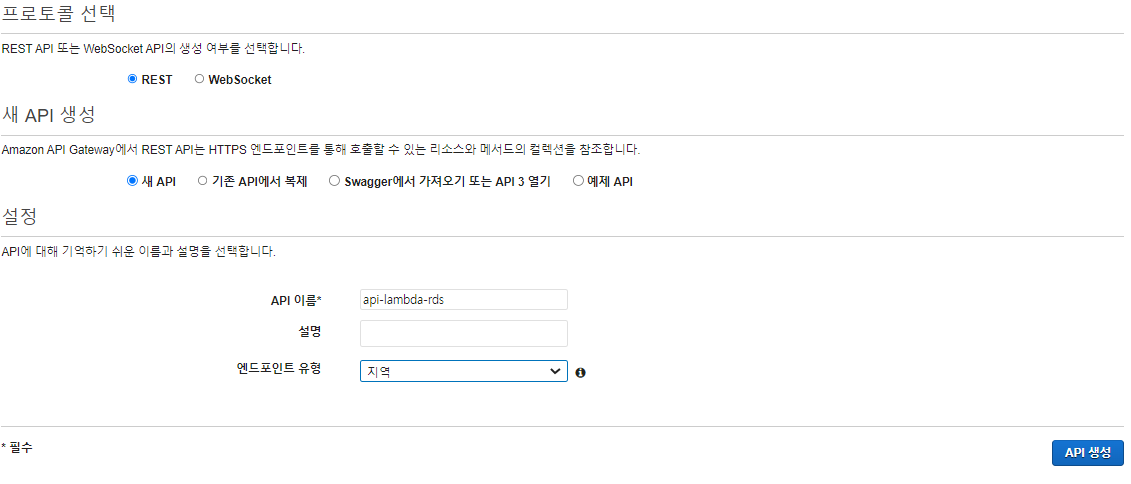 API gateway에 접속해서 API 생성을 누른다.