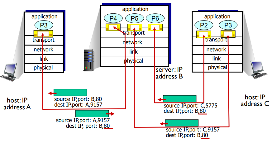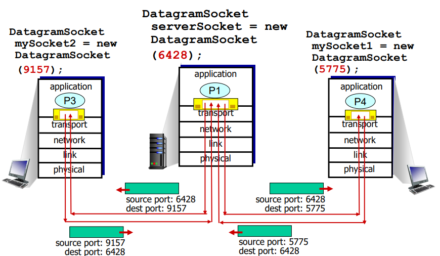 아래 그림과 같이 송신자가 다르더라도 포트 번호만 같으면 같은 소켓으로 세그먼트들을 받는다.