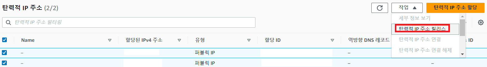 그래서 할당받은 elastic ip들을 모두 release 했다.