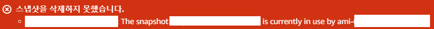 스냅샷을 선택하고 삭제를 했더니 ami에서 사용 중이기 때문에 삭제에 실패했다는 메시지가 떴다.