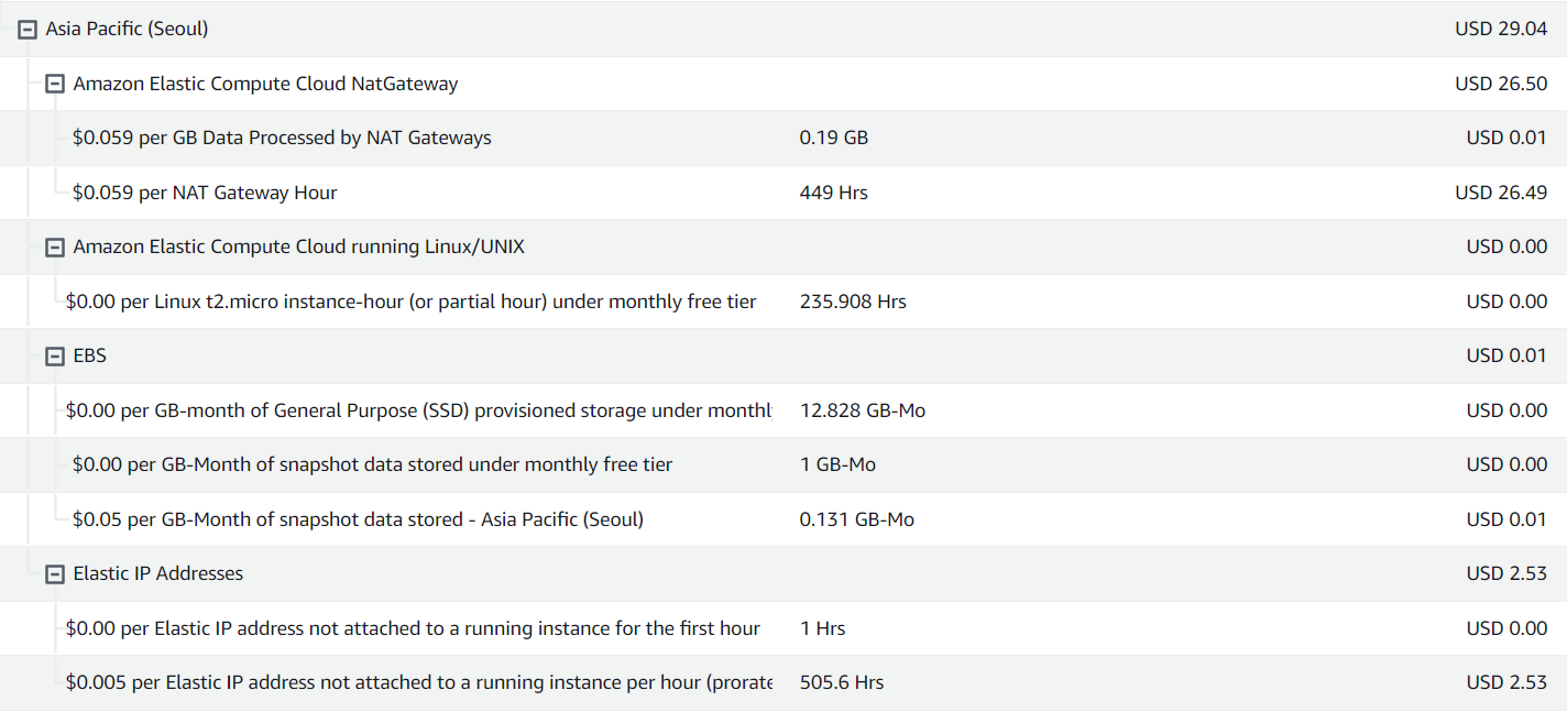 그 당시 나는 그냥 "EC2만 꺼두면 요금이 발생하지 않겠지"라고 생각을 했는데 그 때 연결했던 NAT gateway에서 계속 비용이 발생했던 것이다.