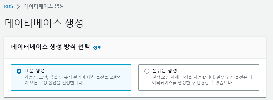 RDS -> 데이터베이스 -> 데이터베이스 생성에 들어간다.