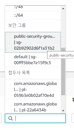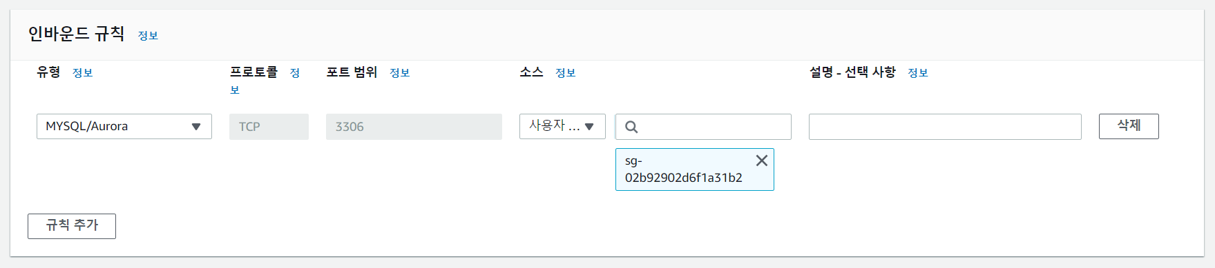 public subnet에 있는 EC2와 달리 private subnet에 있는 데이터베이스는 EC2에서만 접근하도록 할 예정이므로 인바운드 규칙에 EC2의 보안 그룹을 선택하면 된다.