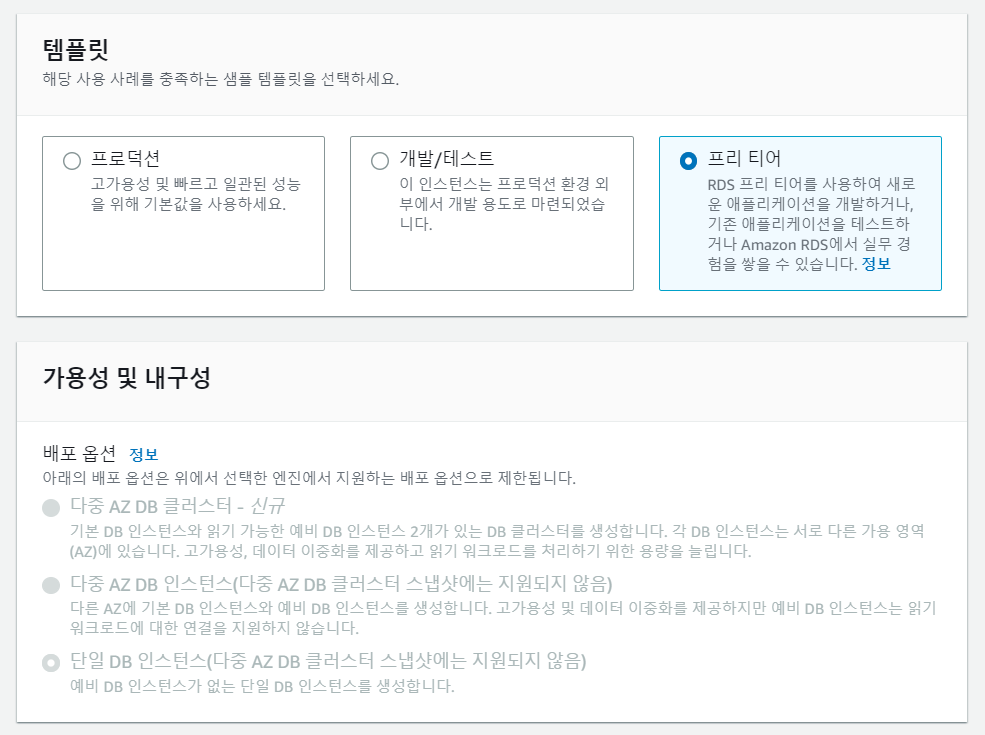 그런데 프리 티어에서는 RDS의 멀티 AZ 기능을 사용할 수 없다.