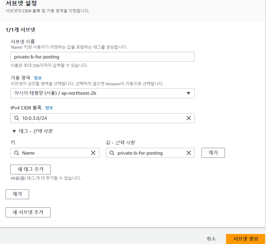 적절한 이름을 지어주고 가용 영역은 "ap-northeast-2b"를 선택하고 CIDR 블록은 10.0.3.0/24로 설정하고 생성한다.