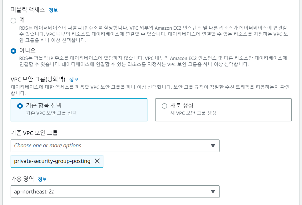 퍼블릭 액세스를 거부하고 미리 만들어두었던 보안 그룹을 선택한다.