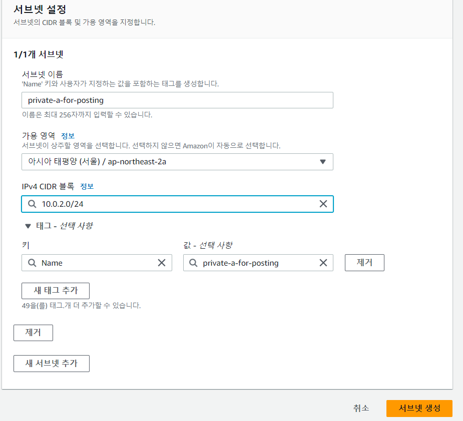 적절한 이름을 지어주고 가용 영역은 "ap-northeast-2a"를 선택하고 CIDR 블록은 10.0.2.0/24로 설정하고 생성한다.