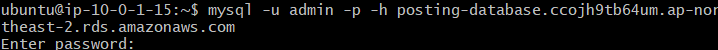 mysql -u [마스터 사용자 이름] -p -h [데이터베이스 엔드포인트]
