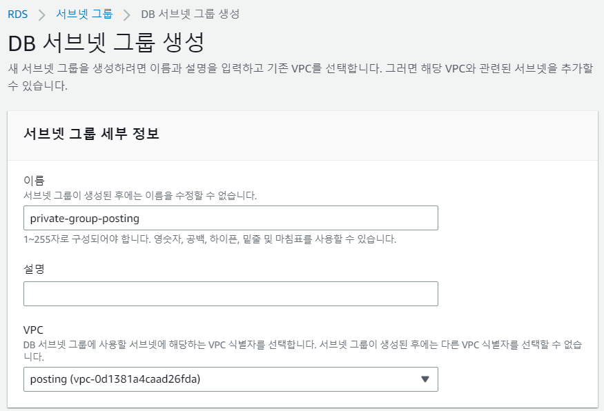 서브넷 그룹에 서로 다른 가용 영역에 존재하는 서브넷 두 개를 넣어서 할당할 예정이다.