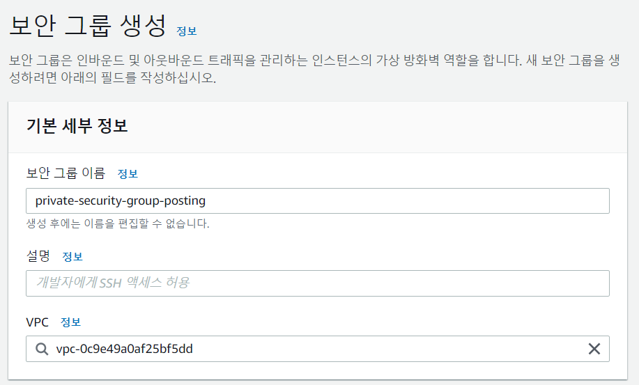VPC -> 보안 그룹 -> 보안 그룹 생성에 들어간다.