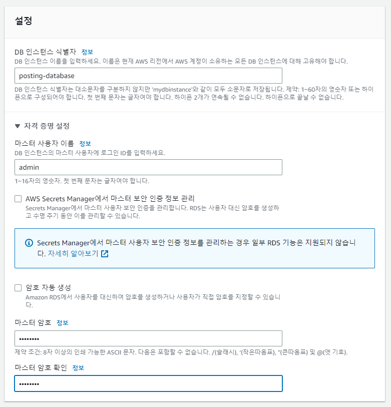 원하는 식별자를 지어주고 마스터 사용자 이름과 암호는 기억해둔다.