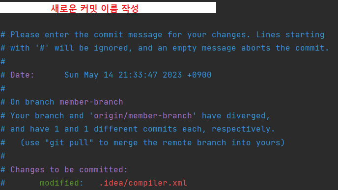 명령어 입력하면 가장 윗 줄에는 현재 커밋 메시지가 나와있고 이를 변경할 수 있다.