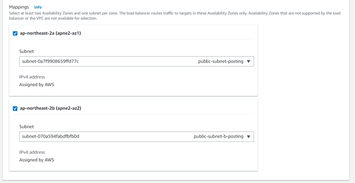 우리의 VPC를 선택해주고 생성한 public subnet 두 개를 선택한다. (서로 다른 가용 영역이어야 한다.)