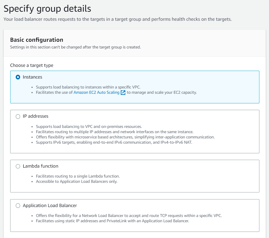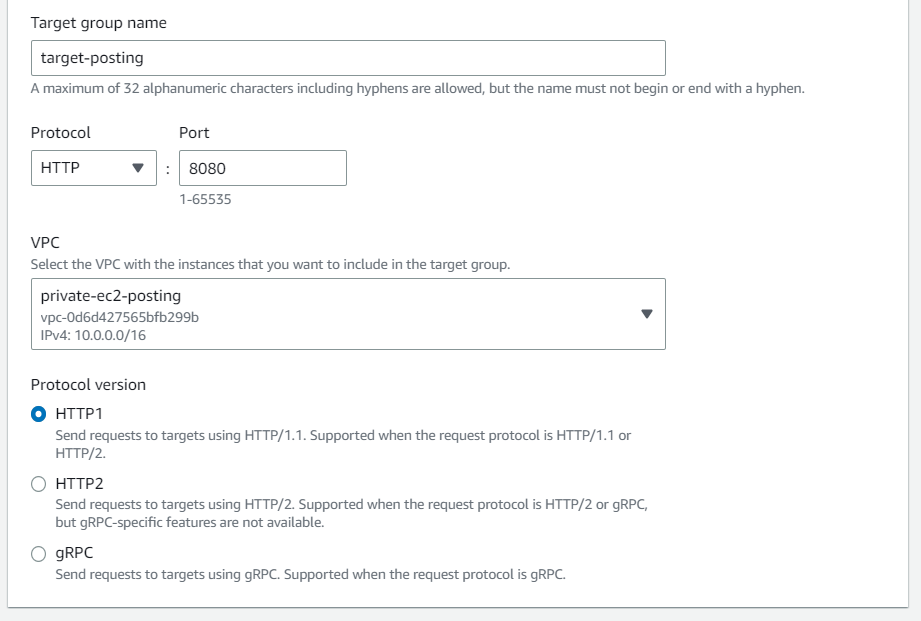 - 타겟 그룹에는 EC2 인스턴스들이 들어가는데 요청이 들어갈 포트 번호를 지정한다. ex) 스프링 부트의 default 포트번호는 8080