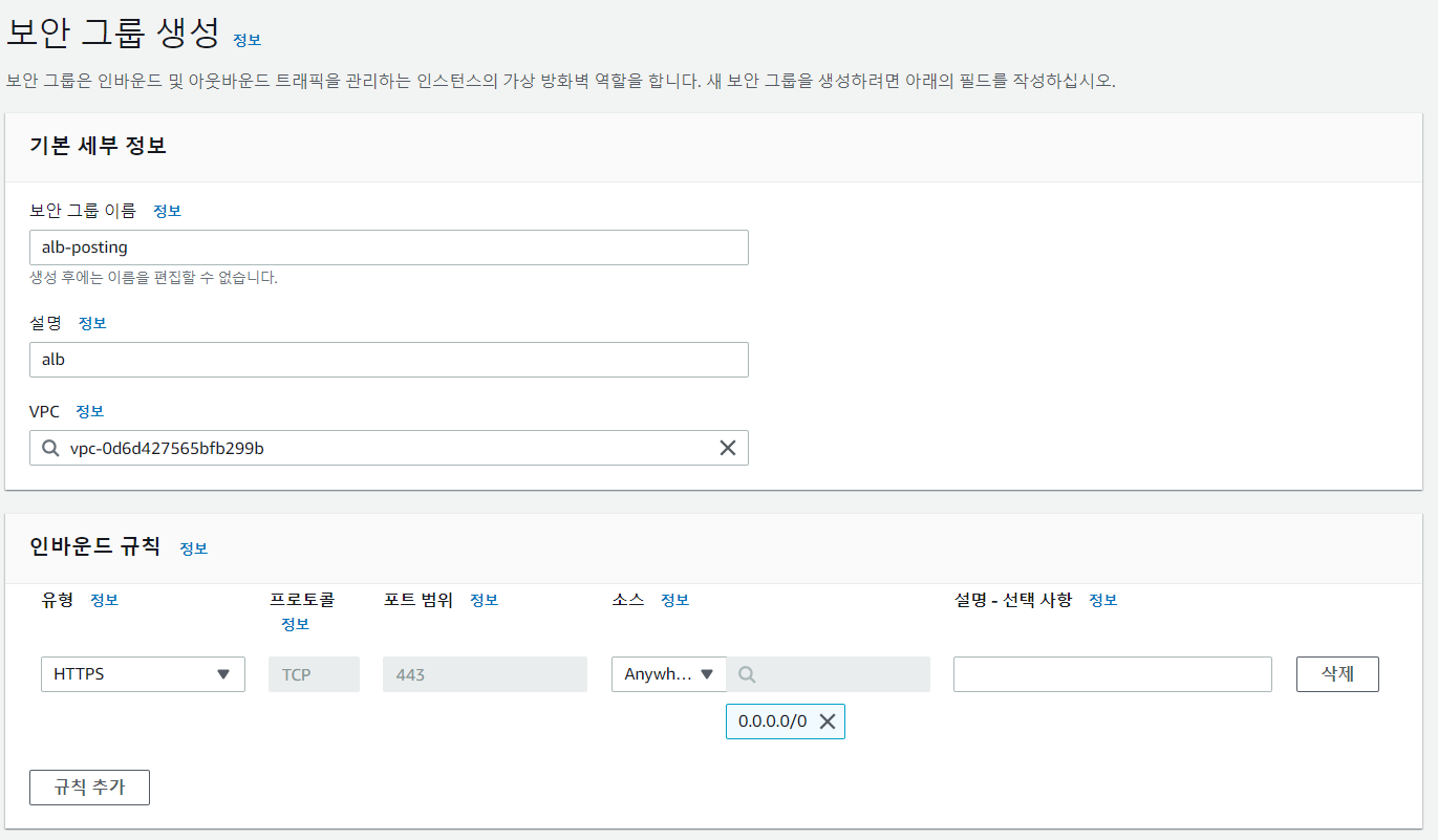 ALB의 보안 그룹을 생성한다. 인바운드 규칙은 HTTPS 요청을 추가한다.