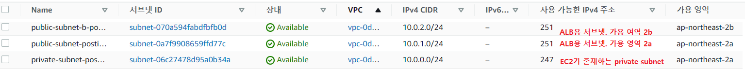 참고로 서로 가용 영역이 다른 public subnet 두 개를 생성해야한다.
