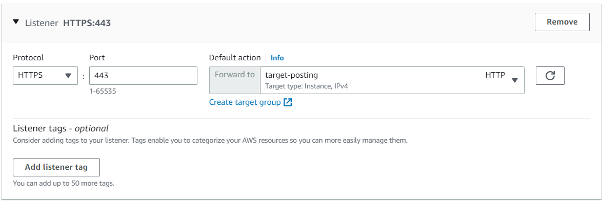 - https 요청에 대해 타겟 그룹으로 향하게하는 리스너를 추가한다.