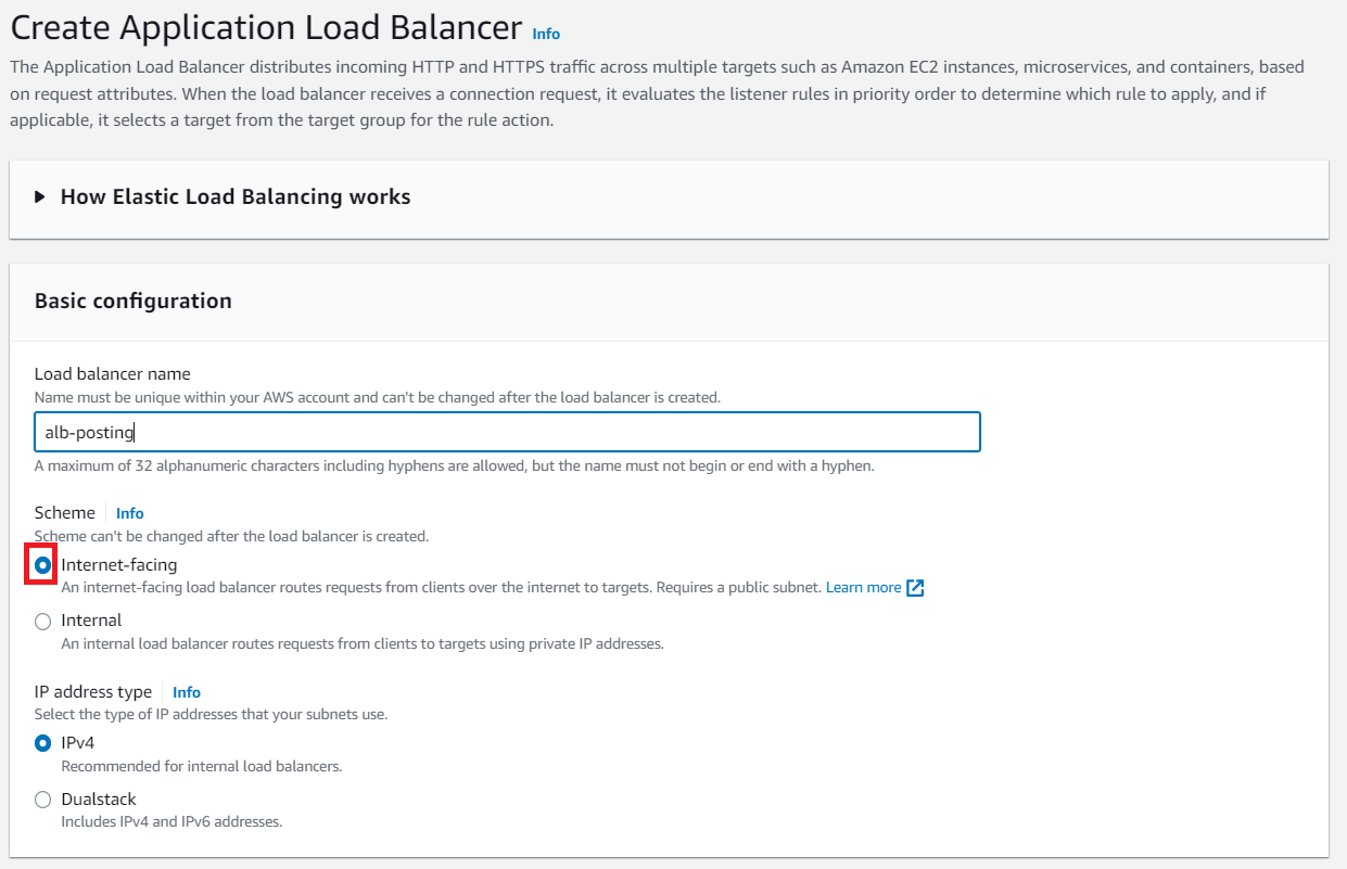 이름을 정하고 인터넷 요청을 받아야하므로 internet-facing을 선택한다.