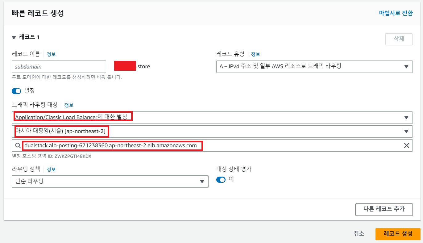 Route53 -> 호스팅 영역 -> 우리가 구매한 도메인 -> 레코드 생성으로 이동한다.
