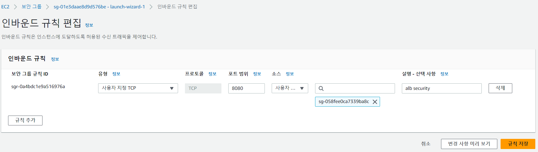 - EC2 인스턴스의 보안 그룹의 인바운드 규칙에 ALB의 보안 그룹을 허용한다.