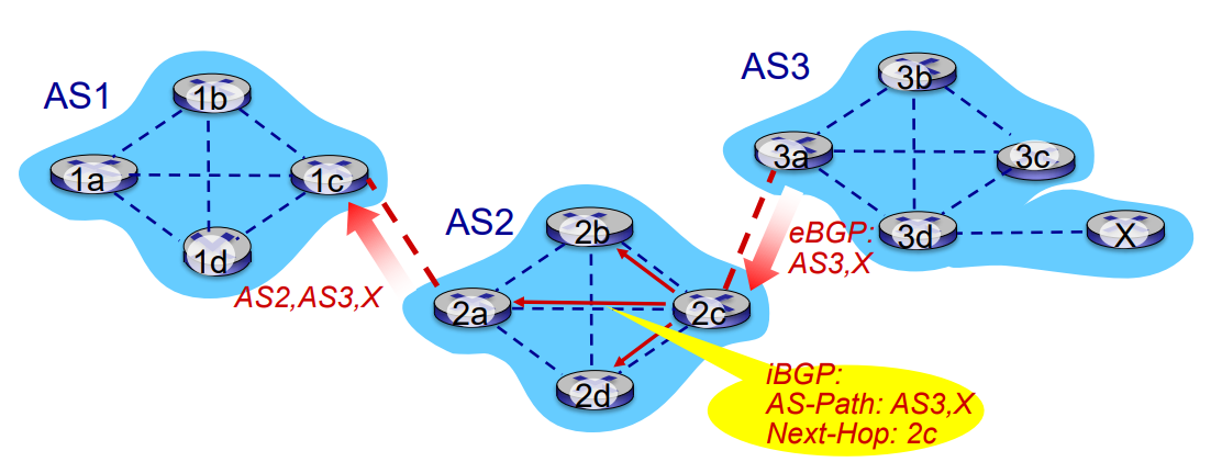 AS2의 gateway router는 iBGP를 통해서 AS2의 정책을 바탕으로 AS2 내부 라우터들에게 X까지 도달하기 위한 경로를 알려준다.