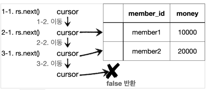 위 그림과 같이 ResultSet은 커서라고 보면 된다. 처음에는 컬럼들을 가리고 있고 next() 메소드를 사용하면 그 다음 행으로 이동할 수 있다.
