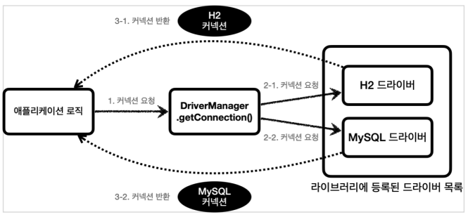 DriverManager가 라이브러리에 등록된 드라이버들에게 커넥션 요청을 보낸다.