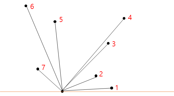 2. 기준으로 잡은 점을 관통하는 x축에 수평인 직선을 긋고 각도를 계산한 후 작은 순서대로 번호를 매긴다.